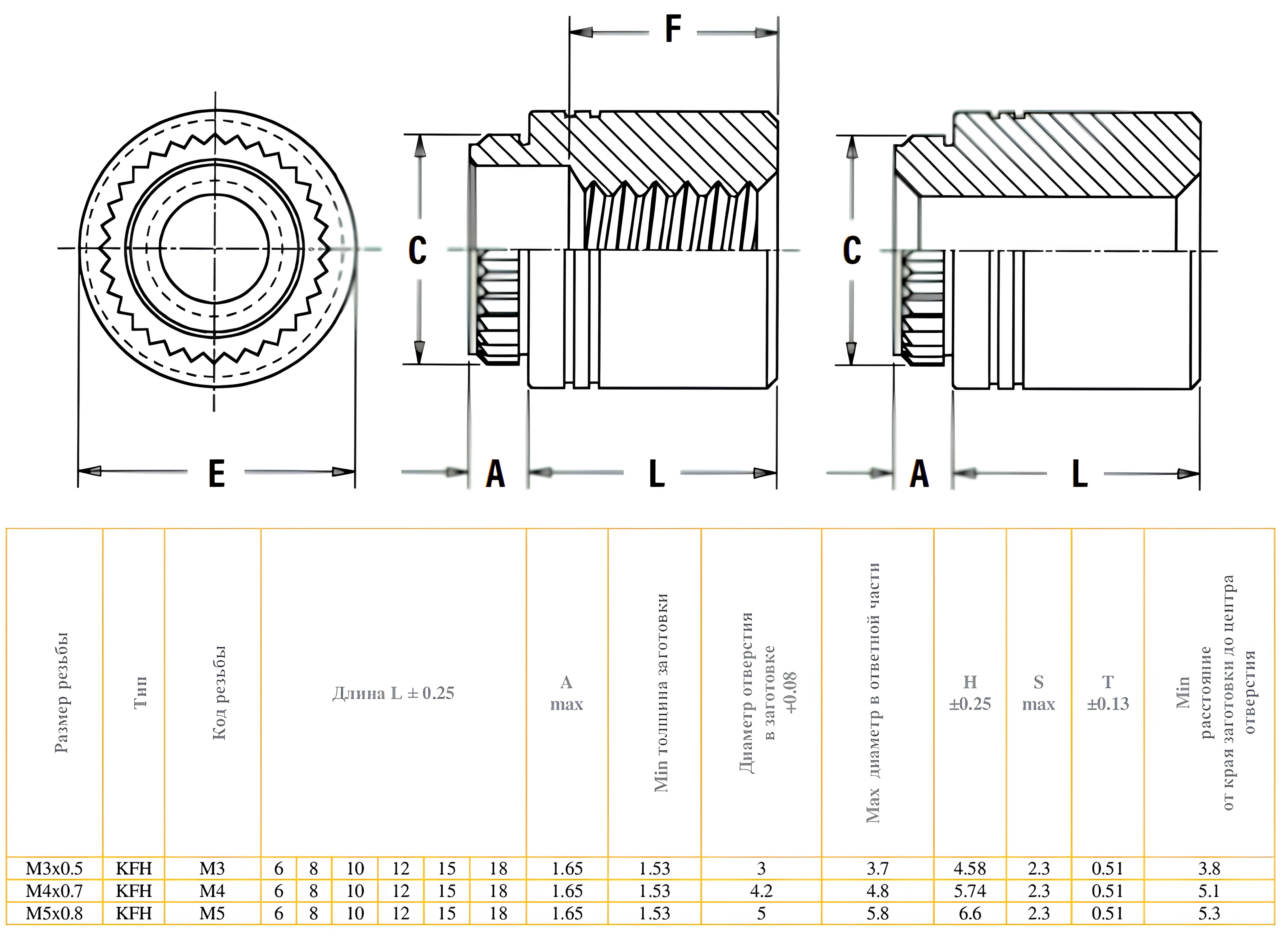 Резьбовые шпильки запрессовочные KFH предназначены для установки в печатных платах. Шпильки обеспечивают прочную наружную резьбу в непластичных материалах, таких как печатные платы, поликарбонат, акрил, стеклосодержащие эпоксидные смолы и компоненты ламината, а также пластичные панели с максимальной твердостью 55HRB.