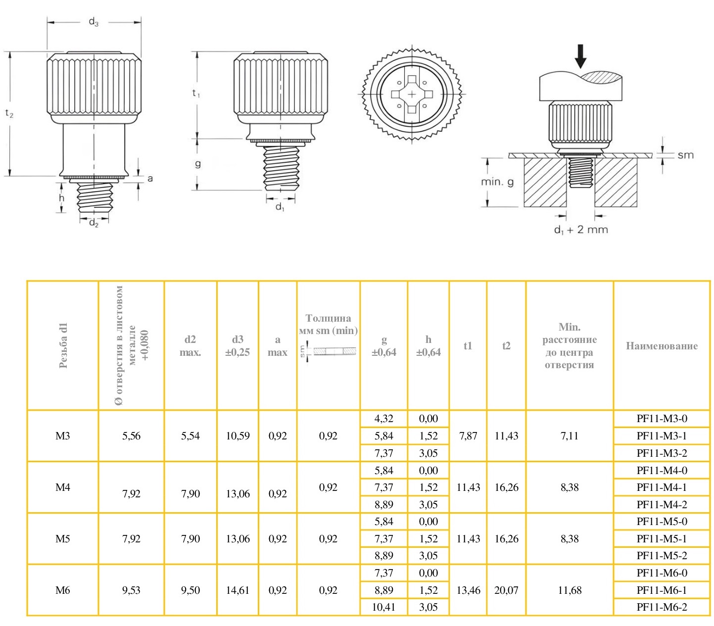 Запрессовочные винты PF11 для крепления панелей можно купить в нескольких размерах резьбы. Применяются для крепления металла с максимальной твердостью 70 HRB для нержавеющей стали и твердостью 80 HRB для стали.