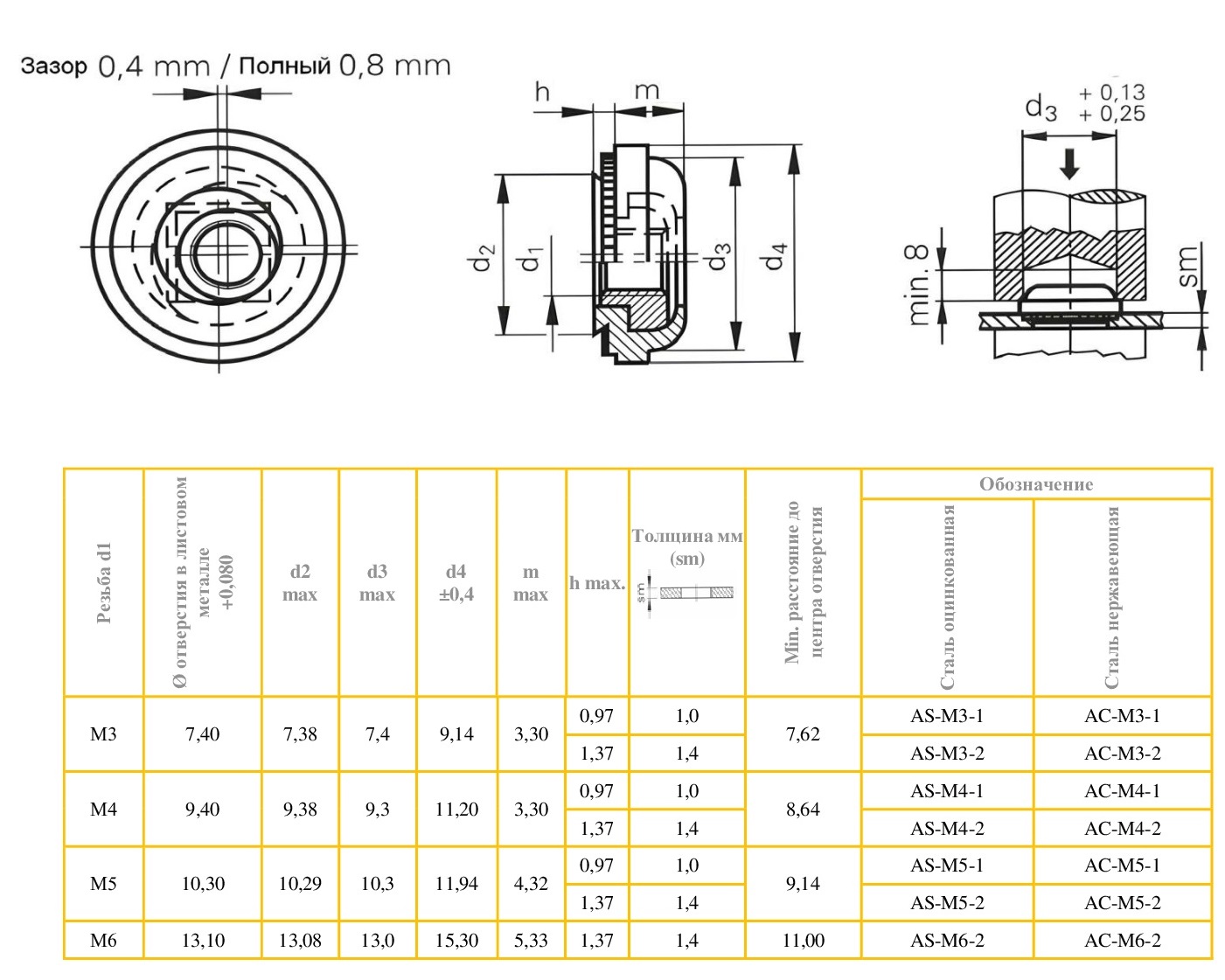 Запрессовочная гайка тип AS с подвижным («плавающим») сердечником из оцинкованной закаленной углеродистой стали. Оцинкованное покрытие продлевает срок службы гайки, повышая ее устойчивость к коррозии. Подвижный сердечник гайки позволяет регулировать положение оси резьбы в пределах от 0,38 до 0,76 мм, компенсируя несоосность сопрягаемых отверстий, что значительно упрощает монтаж конструкции. Устанавливается заподлицо с одной стороны заготовки. Резьба в подвижном сердечнике гайки обеспечивает дополнительную прочность и надёжность соединения. Размерность от М3 до М6. От одного до двух вариантов высоты обратного конуса гайки в каждой размерности, выбор которого зависит от толщины материала, в который будет запрессовываться крепеж. Рекомендована для монтажа в стальные и алюминиевые заготовки твердостью до HRB 70 и толщиной от 0,97 мм.
