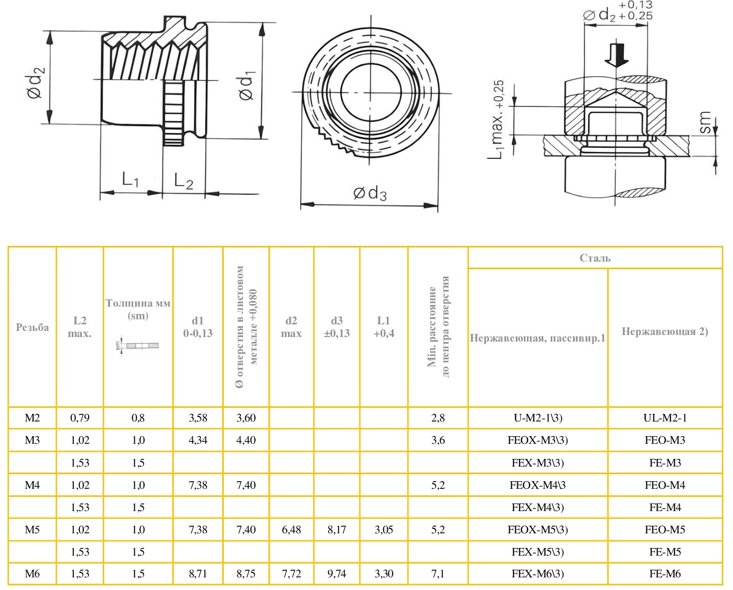 Миниатюрная запрессовочная гайка с минимальными габаритными размерами тип FEX из нержавеющей стали AISI 303 для создания разъемного резьбового соединения в тонколистовых материалах с меньшим расстоянием от края заготовки в сравнении со стандартными запрессовочными гайками. Имеет круглую форму и многоразовую резьбу класса прочности 2B/6H. Хорошая устойчивость к коррозии. Прочная зубчатая накатка гайки и дополнительная выемка, заполняемая вытесняемым при запрессовке материалом, обеспечивают высокое сопротивление крутящему моменту (провороту) и отрыву. Размерность от М3 до М6. Рекомендована для монтажа в металлические заготовки твердостью до HRB 70 толщиной от 1,5 до 1,78 мм, минимальное расстояние от края заготовки 3,6 мм.